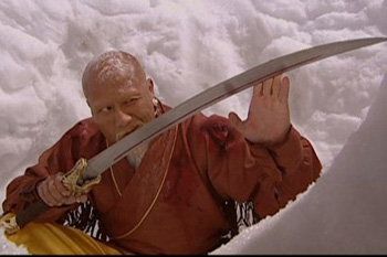 狄云扯光了须发,又穿上了宝象的僧衣,被人误认为采花淫僧,衙门公人来缉捕,汪啸风来帮忙插上一手,眼见就要一剑杀死狄云,狄云只有苦笑自己运气太坏。此一苦笑,包含多少辛酸和无奈,狄云的确是命不好,生就的倒霉蛋。正引颈就剑,忽然奔出正牌的血刀老祖来,轻松打退汪啸风,救了狄云,并抢走穴道被点,无还手之力的水笙,骑了铃剑双侠的黄马白马公然离去。原来血刀老祖是宝象的师父,误以为狄云是宝象的徒弟,故有此救人之举。 狄云夹在中间,无从分辩,虽然明知血刀老祖是大坏人,但离了他马上要死于那些名门正派的侠士们手里,所以也只有识时务,得过且过,走一程算一程。此后狄云多次心怀鬼胎,想救水笙,偏偏让水笙更误会,以为狄云要对其非礼,而狄云在迷惘无奈之中,敷衍血刀老祖,竟让血刀老祖对他大为喜欢,一再称他良心好,乖孩儿。双重的误会,不断加深,使狄云尴尬至极。 血刀老祖凶恶至极,武功却又是十分高明,一人独战一路来追赶他的江南群雄,竟然并不怎么费力,每每在危险时刻都能全身而退;血刀老祖的厉害,使故事因复杂化而变得更为紧张。“落花流水”在雪谷中大战血刀老祖,本来是可以稳操胜券的,但天时地利盲目地站到了血刀老祖那边,凭着极恶的悍勇和雪地作战的经验,血刀老祖反而占了上风。先是由于花铁干急于求成,反而失误,失手刺死了“落花流水”中的刘乘风。接下来血刀老祖又用诡计杀了陆天抒,斩断了水岱的双足,花铁干的斗志彻底丧失,双膝软了下来,跪着投降,苟且活命。 陆天抒、刘乘风、水岱牺牲后,血刀老祖其实已是强弩之末,但花铁干丧失了机会,狄云不知究里也不敢轻举妄动,水笙激愤之下自行冲开穴道,但又因悲伤而心神不定丧失良机,再次失手。最后,当血刀老祖略恢复内力,抢过血刀要杀水笙之时,狄云出手相救,和血刀老祖缠斗在一起。血刀老祖扼住狄云的颈子之时,意想不到的奇迹出现了,狄云在极度的窒息中,体内未练成的神照功发挥了潜力,必死之境反而帮助他自动冲开了任督二脉,神功初成,一脚蹬死了血刀老祖。十大恶人上榜人物中,血刀老祖排名第九。 |