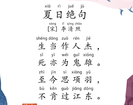 《夏日绝句》是李清照在南宋时期创作的一首词,全词共有四十四字,分为上下两阙。上阙以“生当作人杰,死亦为鬼雄”开篇,下阙以“至今思项羽,不肯过江东”收尾。这首词虽然篇幅短小,但却饱含深意,表达了李清照对项羽英勇不屈精神的深深敬仰。